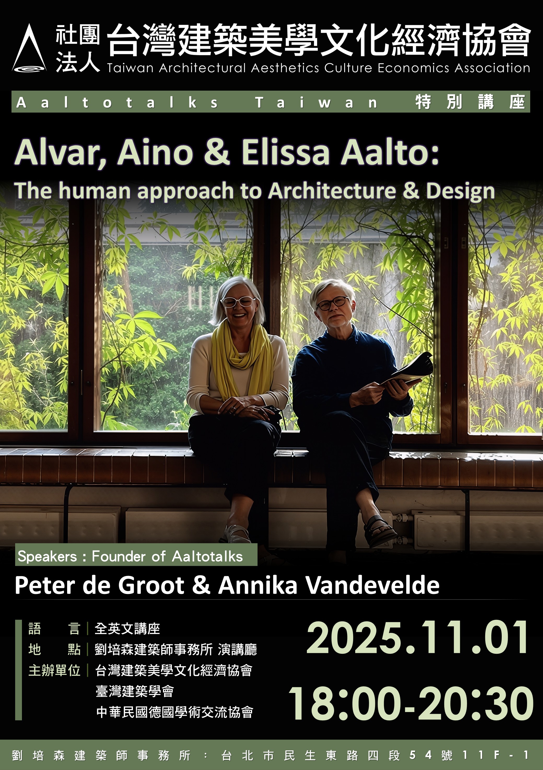 臺灣建築學會非常榮幸與台灣建築美學文化經濟協會等單位共同主辦首場【Aaltotalks Taiwan特別講座】。本次講座將邀請「Aaltotalks」創辦人 Peter de Groot 夫婦來台,與台灣建築與設計專業人士,共同探討20世紀現代主義大師 Alvar Aalto 及其兩任妻子 Aino、Elissa 的設計理念與作品精髓。
